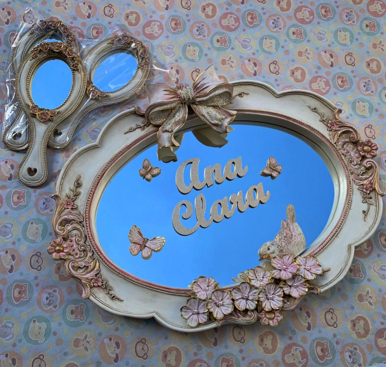 Os apliques de flores e borboletas remetem a jardim, o que proporciona um cenário dentro da moldura.